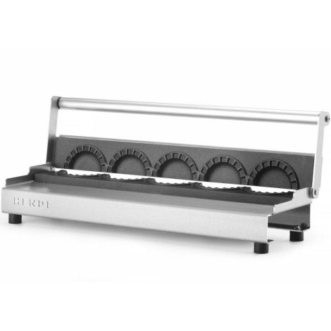 poprzez przygotowanie jednocześnie 5 pierogów. Powierzchnia robocza (gniazda formy) wykończona powłoką nieprzywierającą dla łatwego zdejmowania gotowych pierogów. Uchwyt na całej długości formy umożliwia stosowanie równomiernego nacisku na wszystkie formy.