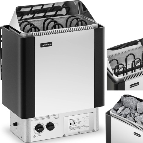 Piec do sauny marki Uniprodo sprawdzi się do pomieszczeń o wielkości 3-6 m3. Moc urządzenia wynosi 4.5 kW, co sprawdza się dla dedykowanej kubatury i pozwala osiągnąć temperaturę 110deg C. Panel sterowania znajduje się na urządzeniu. Za jego pomocą można określić temperaturę oraz czas pracy. Urządzenie wykonane zostało z solidnych materiałów, cynku, aluminium i stali nierdzewnej, jest odporne na korozję i uszkodzenia mechaniczne. Piec jest wodoodporny, posiada klasę ochrony IPX4. Bezpiecznik uniemożliwia przegrzanie sprzętu.