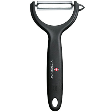 Obieraczka marki Victorinox umożliwia łatwe obieranie zarówno twardych warzyw, jak i miękkich owoców. Sprawdzi się do pomidorów i kiwi. Obieraczka posiada ząbkowane ruchome ostrze, z łatwością dostosowuje się do powierzchni cięcia. Uniwersalna w obsłudze zarówno dla prawo jak i lewo ręcznych. Posiada końcówkę do oczkowania. Uchwyt został wykonany z tworzywa sztucznego.