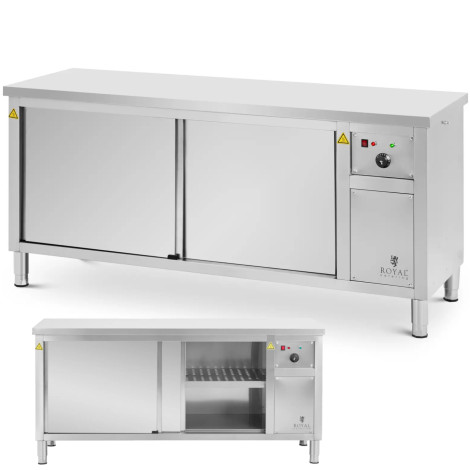 Szafka grzewcza marki Royal Catering sprawdzi się do przygotowywania posiłków lub jako miejsce do przechowywania. Jej wnętrze oferuje dużo przestrzeni na gotowe dania, miski lub talerze. Podgrzewacz zmieści wszystkie przybory kuchenne. Wystarczy ustawić żądaną temperaturę w zakresie od 30 do 80deg C za pomocą pokrętła. Dioda LED zasygnalizuje osiągnięcie wybranej wartości. Perforowana półka zapewnia efektywną cyrkulację powietrza, a co za tym idzie optymalną dystrybucję ciepła. Przesuwne drzwi łatwo otworzyć, zamknąć a także nie zabierają cennego miejsca, nawet w małych kuchniach. Blat roboczy o wymiarach 180 x 60 cm umożliwia wygodne przyrządzenie posiłków. Powierzchnia ze stali nierdzewnej jest stabilna i trwała dzięki wzmocnieniu z płyty MDF Omega i grubości 47 mm. Konstrukcja szafki grzewczej jest spawana i wykonana z odpornej na korozję stali nierdzewnej (304). Materiał spełnia wszystkie wymagania gastronomiczne. Dzięki nośności do 500 kg nadaje się zarówno do codziennego przechowywania, jak i jako stół roboczy. Duże nóżki o regulowanej wysokości zapewniają właściwą stabilność.