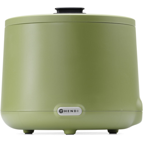 Kociołek elektryczny marki Hendi pozwala utrzymać w cieple zupę. Zaprojektowany został przez holenderskiego projektanta Roberta Bronwassera, posiada nowoczesną obudowę i jest dostępny w 3 stylowych kolorach. Posiada funkcję zapamiętywania ostatniej ustawionej temperatury. Urządzenie jest proste w obsłudze, wystarczy podłączyć, napełnić wodą pojemnik a kociołek utrzyma zupę w stałej, idealnej temperaturze. Obudowę kociołka wykonano z polipropylenu odpornego na wysoką temperaturę. Demontowany wkład na zupę ma pojemność 8 l i wykonany został ze stali nierdzewnej AISI 304. Grzałkę wykonano ze stali nierdzewnej AISI 304. Pokrywa ze szkła hartowanego wyposażona została w izolowany uchwyt, wycięcie na chochlę oraz aluminiowy zawias. Specjalna dwuczęściowa konstrukcja pokrywy redukuje utratę ciepła przy otwieraniu, równocześnie zachowując optymalną higienę pracy. Na pokrywie umieszczono uchwyt (holder) na etykietę z nazwą dania. Elektroniczny panel sterowania wyświetla czas pracy, temperaturę zadaną oraz aktualnie ustawioną temperaturę. Temperaturę można regulować w zakresie od 35 do 85deg C co 1deg C. Urządzenie nie jest przeznaczone do gotowania, a jedynie do utrzymywania ciepła.