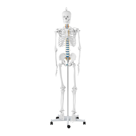 Stand uitgerust met gedraaide cirkelsdie de overdracht van het skelet aanzienlijk vergemakkelijken. De ondersteuning zorgt ervoor dat het model een stabiele, rechtlijnige positie zal handhaven. Bovendien werd de schedel geplaatst