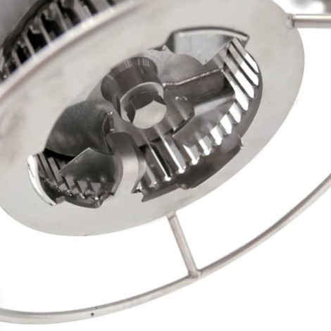 Roestvrij staal 18/10. De mixer kan in verschillende richtingen bewegen, heeft een instelbare hoogte en is bevestigd aan een rolstoel met 4
