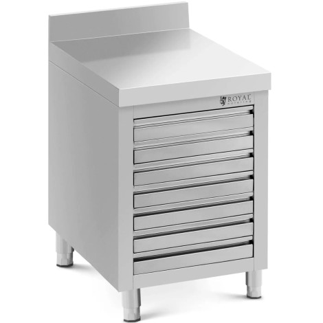 Szafka robocza ze stali nierdzewnej marki Royal Catering łączy solidną konstrukcję z przemyślanym designem, dlatego świetnie sprawdzi się w pizzeriach, piekarniach lub kuchniach o dużej przepustowości. Wzmocniony płytą MDF blat roboczy o wymiarach 50 x 70 cm oferuje dużo miejsca do porcjowania, wyrabiania i formowania kulek ciasta. Po przygotowaniu schowasz je, jak również sosy i inne składniki, do 7 płynnie poruszających się szuflad, z których każda ma wymiary 35,3 x 35,5 x 5 cm oraz pomieści do 5 kg. Dzięki temu szafka gastronomiczna jest idealna do przechowywania żywności lub przyborów roboczych w sposób uporządkowany i higieniczny. Dzięki wysokiej jakości stali nierdzewnej szafka robocza imponuje trwałością i łatwością czyszczenia. Wyposażona jest także w rant chroniący ściany przed zachlapaniem. Dno znajdujące się na wysokości 15 cm od podłogi ułatwia sprzątanie pod szafką, a nóżki regulowane w zakresie do 2 cm pozwalają znaleźć stabilną pozycję na różnych, nawet nierównych powierzchniach. Ponadto szafkę można szybko zmontować w kilku prostych krokach.