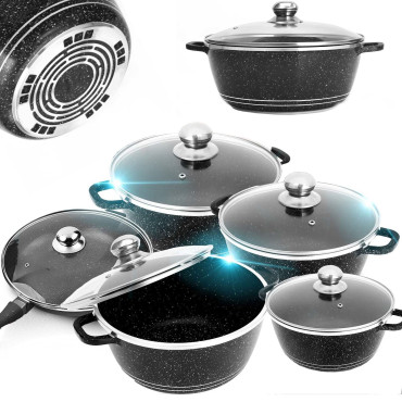 Garnki zostały wykonane z aluminium ze stopu granitu, co zapewnia trwałość, odporność na wysokie temperatury i równomierne rozprowadzanie ciepła. Dzięki nieprzywierającej i odpornej na zarysowania powłoce ceramicznej gotowanie jest wygodne, a czyszczenie szybkie i proste. Nowoczesny design w czarnym kolorze z eleganckimi detalami sprawia, że naczynia doskonale się prezentują i pasują go każdego wnętrza kuchni. W zestawie znajdują się również rękawice ochronne.