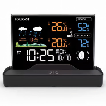Stacja pogodowa Retoo ER1228-1 to nowoczesne i funkcjonalne urządzenie do monitorowania warunków atmosferycznych w domu i na zewnątrz. Wyposażona w bezprzewodowy czujnik zewnętrzny, stacja umożliwia dokładny pomiar temperatury, wilgotności, ciśnienia oraz prognozę pogody. Duży, czytelny ekran LCD prezentuje również fazy księżyca, datę, godzinę oraz umożliwia ustawienie budzika. Synchronizacja radiowa czasu (DCF) zapewnia precyzyjne wskazania. Urządzenie posiada pamięć pomiarów oraz możliwość rozbudowy o dodatkowe czujniki.