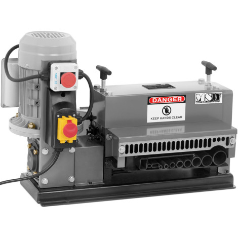 Korowarka do kabli marki MSW pozwala w krótkim czasie ściągnąć izolację z miedzianych i aluminiowych przewodów. Duża moc 750 W zapewnia prędkość cięcia do 16 m/min. Nacisk i ustawienie ostrzy są regulowane w celu dostosowania urządzenia do grubości izolacji. Odizolowywacz wyposażono w 11 otworów na kable o rozmiarach 38 mm, 28 mm, 23,5 mm, 17, 5 mm, 15 mm, 11 mm, 10,5 mm, 7 mm, 18 x 8 mm, 12 x 6 mm, 26 x 16,5 mm. Bezpieczeństwo pracy zapewnia wyłącznik awaryjny, który odcina zasilanie. Przełącznik ON/OFF posiada ochronę przed kurzem i brudem. Urządzenie można dla większej stabilności przykręcić do stanowiska pracy.