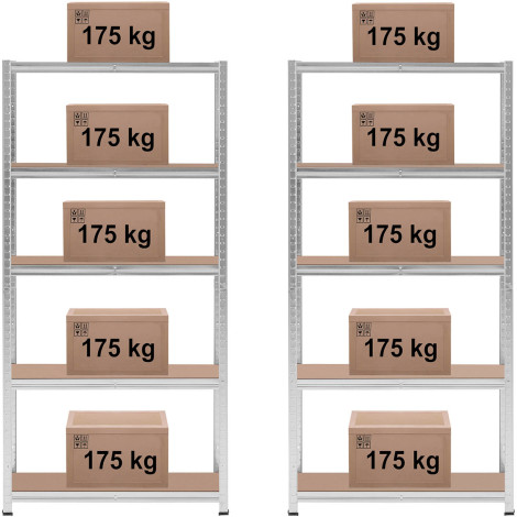 5 jednolitych półek o regulowanej wysokości pozwala na umieszczenie różnorodnych rzeczy. Każda półka ma nośność 175 kg. Słupki zostały wykonane z galwanizowanej stali, są odporne na rdzę i wymagają niewielkiej konserwacji.