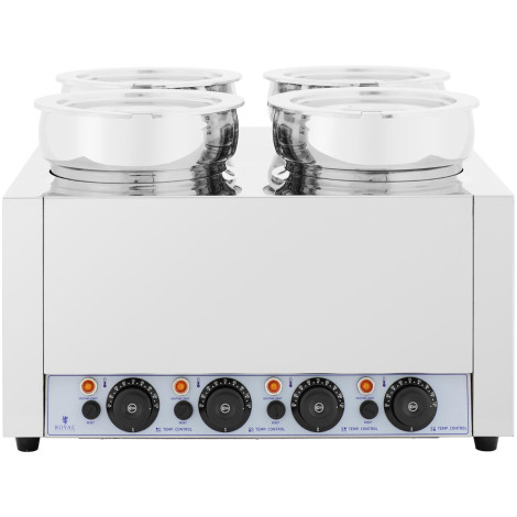 Stacja do zupy marki Royal Catering sprawdzi się w restauracji, jadłodajni czy małej gastronomii do utrzymywania w cieple zup, gulaszów, sosów, czekolady czy kremowego serowego fondue. Stacja wyposażona została w dwa okrągłe garnki o pojemności 4 x 7 l i dopasowane pokrywki. Temperatura regulowana jest w zakresie 30-110deg C za pomocą czterech pokręteł. Moc podgrzewacza wynosi 2000 W. Bemar działa jako system zamknięty i nie musi być napełniany wodą. Podgrzewacz wykonano ze stali nierdzewnej, jest trwały, wytrzymały i łatwy w czyszczeniu.