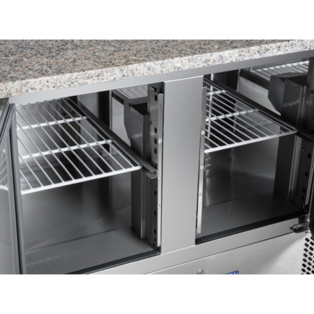 Dzięki dodatkowym prowadnicom można zwiększyć ilość półek i pojemników GN 1/1 w szafkach w stole chłodniczym.