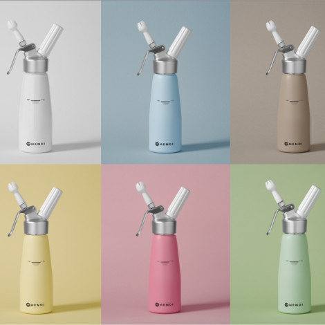 HENDI 975886Syfon do bitej śmietany marki Hendi umożliwia przygotowanie najbardziej fantazyjnych deserów. Prezentowany wzór świetnie nadaje się zarówno do profesjonalnej kuchni, jak i do użytku domowego. Pojemność syfonu to 0.5 l.