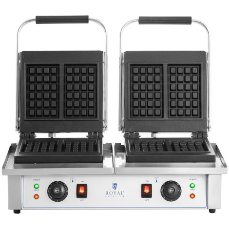 Gofrownica marki Royal Catering sprawdzi się w każdej kawiarni, restauracji czy w budce z goframi. Umożliwia szybkie przygotowanie chrupiących złotobrązowych gofrów w belgijskim stylu. Urządzenie posiada dużą moc 2 x 2000 W, która pozwala przygotować 4 gofry o grubości 2,5 cm i wielkości 170 x 170 mm jednocześnie. Temperatura ustawiana jest osobno dla każdego stanowiska w zakresie 50-300deg C. Płyty ze strukturą umożliwiają łatwe wyjmowanie upieczonych gofrów. Zintegrowane zabezpieczenie przed przepełnieniem zapobiega zabrudzeniu urządzenia nadmiarem ciasta i ułatwia jego czyszczenie. Uchwyty są izolowane dla bezpiecznego użytkowania.