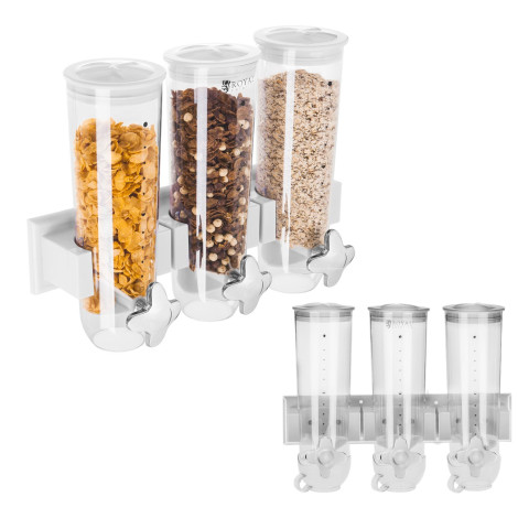 Trzy przezroczyste zbiorniki z bezpiecznego dla żywności tworzywa sztucznego pozwalają  na bieżąco kontrolować poziom napełnienia. Dobrze chronią suche produkty przed rozmaitym oddziaływaniem z zewnątrz (kuchenne zapachy, wilgoć itp.). Model RCCS-4,5L/3W posiada gumowe wyloty, które nie kruszą płatków, umożliwiając jednocześnie wygodne ich porcjowanie. Urządzenie zawiesza się na ścianie, dzięki czemu zajmuje niewiele miejsca.
