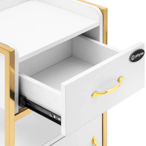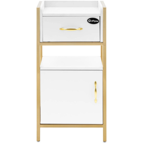 Szafka stojąca marki Physa sprawdzi się do przechowywania przyborów i potrzebnych akcesoriów. Wymiar szafki wynosi 82 x 32 x 38 cm. Konstrukcję mebla wykonano ze stali nierdzewnej, która jest wyjątkowo stabilna a samą szafkę z płyty MDF. Szafka posiada pojemną komorę oraz szufladę i dwie półki. Jej gładkie powierzchnie są łatwe w czyszczeniu. Mebel za sprawą złotej ramy ma atrakcyjny wygląd i doda szyku każdemu salonowi piękności.