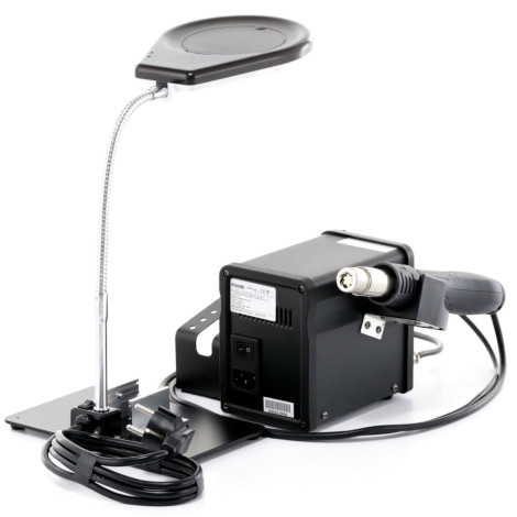 Doskonałą widoczność podczas pracy zapewnia dołączona do zestawu lampka ze szkłem powiększającym. Wyposażono je w 40 diod LED, które zapewniają światło przyjazne dla oka. Szkło powiększa pięcio- oraz dziesięciokrotnie, co sprawdzi się podczas bardzo wymagających zadań. Poza stacją i lampką w zestawie znalazły się groty do kolb, pęseta, podnośnik do komponentów oraz taśma do rozlutowywania.