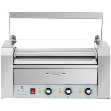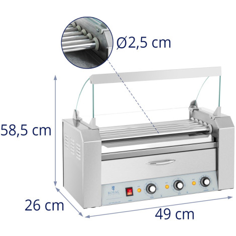 Kod producenta: 10011691 Grill rolkowy marki Royal Catering sprawdzi się w barach, bufetach, stacjach benzynowych czy na imprezach plenerowych. Pozwala przygotować jednocześnie 8 parówek do hot-dogów, frankfurterek, kabanosów czy kiełbasek do tortilli. Równomierne obroty o 360deg sprawiają, że wędlina będzie jednakowo zarumieniona z każdej strony. Wytopiony tłuszcz zbiera się w tacy, którą łatwo wyjąć i umyć. Szuflada grzewcza zapewnia podgrzanie bułek w temperaturze od 30 do 110deg C. Dwie strefy grzewcze umożliwiają niezależne ustawienie temperatury. Parówki mogą się grillować lub być tylko podgrzewane. Temperatura jest regulowana jest w zakresie 30-250deg C. Pokrywa z hartowanego szkła chroni żywność przed zanieczyszczeniami i pozwala przyrządzać kiełbaski na oczach klientów. Cechy produktu:
