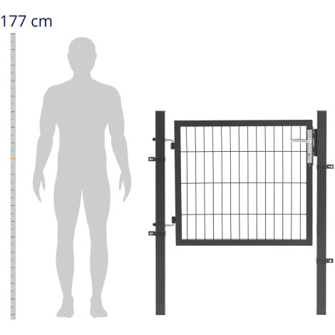105 x 131 cm wykonana jest z wysokiej jakości stali malowanej proszkowo, która chroni bramkę przed rdzą i promieniowaniem UV. Solidne słupki gwarantują stabilną podstawę. Podczas montażu można zdecydować o tym, czy furtka ogrodowa otwiera się do wewnątrz, czy na zewnątrz. Po ustawieniu słupków bramkę metalową można zawiesić na zawiasach bez użycia narzędzi. Oprócz słupków w komplecie znajduje się również klamka, zamek oraz 3 klucze. Dzięki oczkom siatki furtka ogrodowa doskonale pasuje do standardowych płotów z paneli ogrodzeniowych. Można ją łatwo połączyć z innymi rodzajami ogrodzeń, takimi jak murki, żywopłoty czy płoty z drutu.