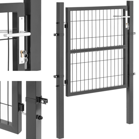 106 x 100 cm wykonana jest z wysokiej jakości stali malowanej proszkowo, która chroni bramkę przed rdzą i promieniowaniem UV. Solidne słupki gwarantują stabilną podstawę. Podczas montażu można zdecydować o tym, czy furtka ogrodowa otwiera się do wewnątrz, czy na zewnątrz. Po ustawieniu słupków bramkę metalową można zawiesić na zawiasach bez użycia narzędzi. Oprócz słupków w komplecie znajduje się również klamka, zamek oraz 3 klucze. Dzięki oczkom siatki furtka ogrodowa doskonale pasuje do standardowych płotów z paneli ogrodzeniowych. Można ją łatwo połączyć z innymi rodzajami ogrodzeń, takimi jak murki, żywopłoty czy płoty z drutu.