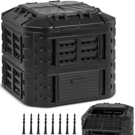 otwory wentylacyjne i system nawadniania kroplowego zapewniające idealne warunki dla odpadów, które się rozkładają. Kompostownik przy gruncie
