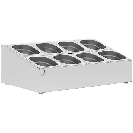 Ekspozytor marki Royal Catering pozwala profesjonalnie przechowywać i podawać wszelkiego rodzaju składniki. Sprawdzi się w bistrach, barach, restauracjach, w cateringu czy food truckach. Stojak dostarczany jest w komplecie z pojemnikami i pokrywkami. Pojemność każdego pojemnika wynosi 1,9 l, łącznie 15,2 l. Ekspozytor wykonany został z wysokiej jakości stali nierdzewnej. Pojemniki GN można łatwo wyjąć i napełnić. Można je myć w zmywarce. Gumowe nóżki stojaka zapewniają mu stabilność i nie rysują blatu.