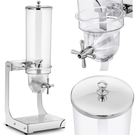Praktyczny dozownik do płatków Royal Catering umożliwia przechowywanie i wygodne dozowanie sypkich produktów: płatków śniadaniowych, niewielkich herbatników i ciastek, cukierków, orzechów, suszonych owoców, kawy. Znajdzie zastosowanie wszędzie tam, gdzie podawane są śniadania w formie bufetu - w hotelach, restauracjach czy bistrach.