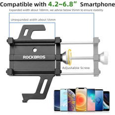 RockBros 699-BK Držiak bicykla, Vyrobené z odolného hliníkovej zliatiny ponúka nielen spoľahlivosť, ale aj univerzálnosť montáže. Vďaka ramene ramena šíreného od 55 do 100 mm, vyhovuje širokej škále modelov telefónov. Univerzálny zostava volantu s priemerom 22 až 31,8 mm je kompatibilný s väčšinou bicyklov. To všetko v elegantnej čiernej farbe.